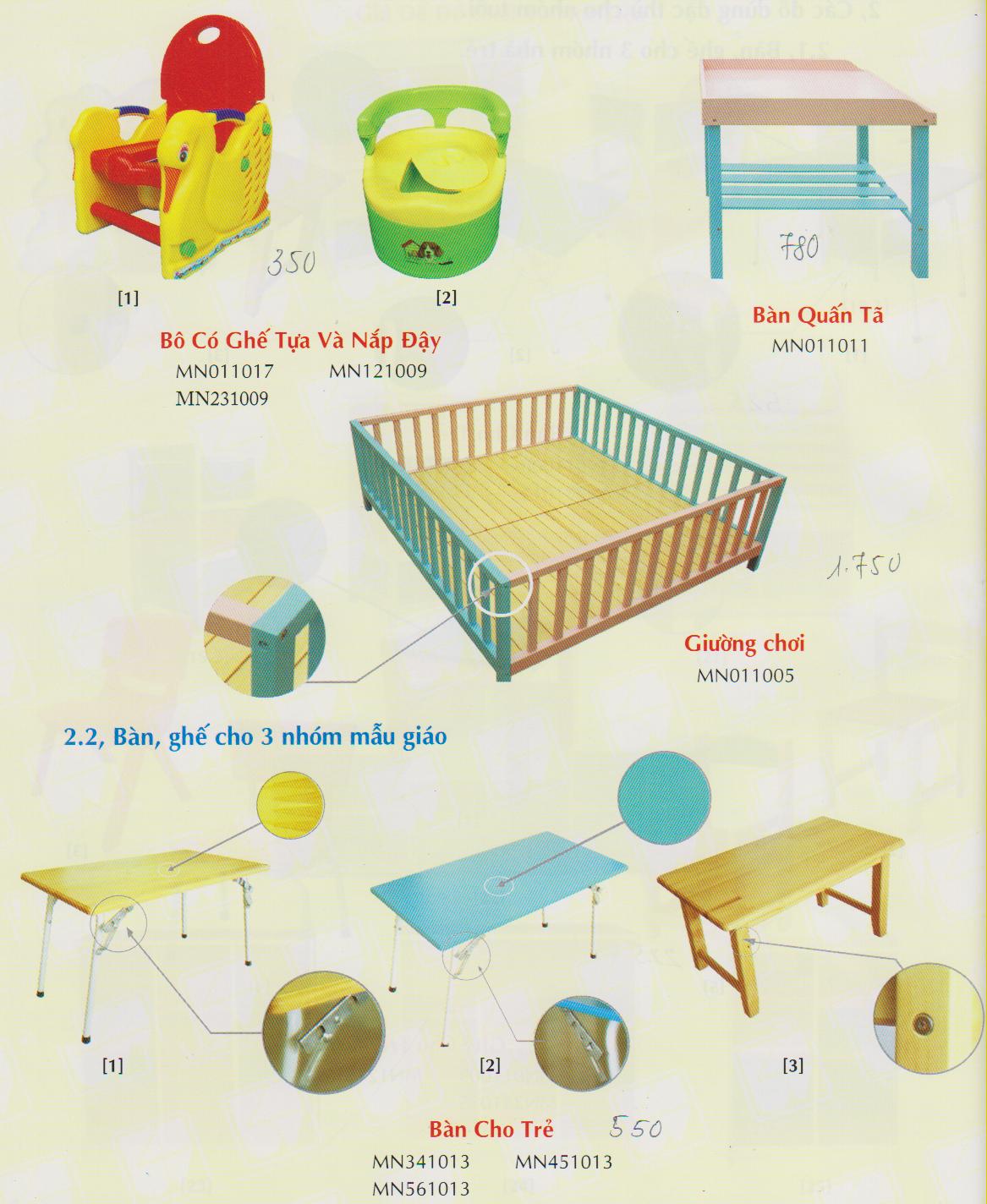 ![]() Các đồ dùng đặc thù cho nhóm tuổi. Bao gồm bô có ghế tựa và nắp đậy; bàn quấn tã và giường chơi dành cho 3 nhóm nhà trẻ; bàn dành cho 3 nhóm mẫu giáo Đặt hàng : 0971817666