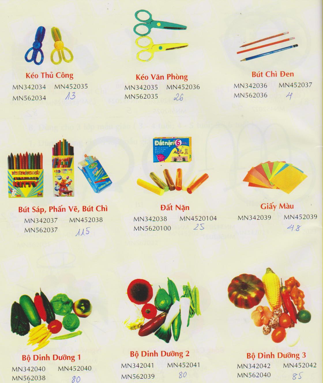 ![]() đồ dùng chung cho 3 lớp mẫu giáo( 3-4 tuổi; 4-5 tuổi; 5-6 tuổi). Bao gồm: kéo thủ công; kéo văn phòng; bút chì đen; bút sáp, phấn vẽ, bút chì; đất nặn; giấy màu; bộ dinh dưỡng 1; bộ dinh dưỡng 2; bộ dinh dưỡng 3 Đặt hàng : 0971817666